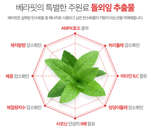 베라핏 다이어트에는 기능성 원료인 돌외잎주정추출분말을 주성분으로 하고 있습니다.