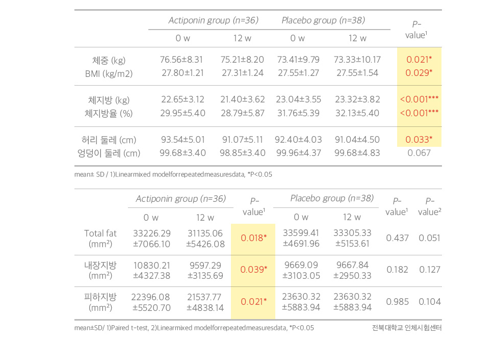 12주간 실험한 결과 체지방, BMI 지수, 체지방, 허리둘레가 감소되었습니다.
