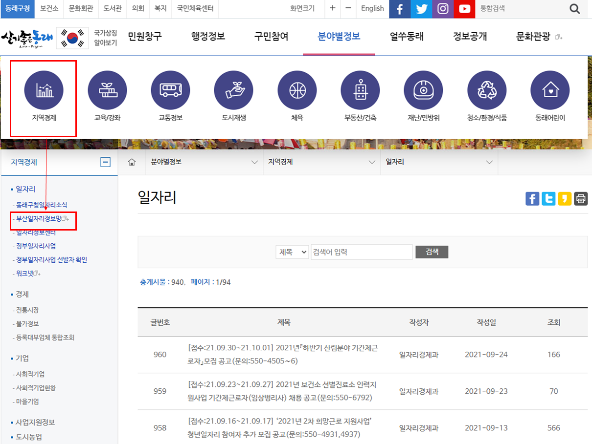 동래구청의 홈페이지에 들어가서, 분야별정보에 "지역경제"를 클릭하시고 , 아래와 같이 "부산 일자리 정보망"으로 접속합니다.