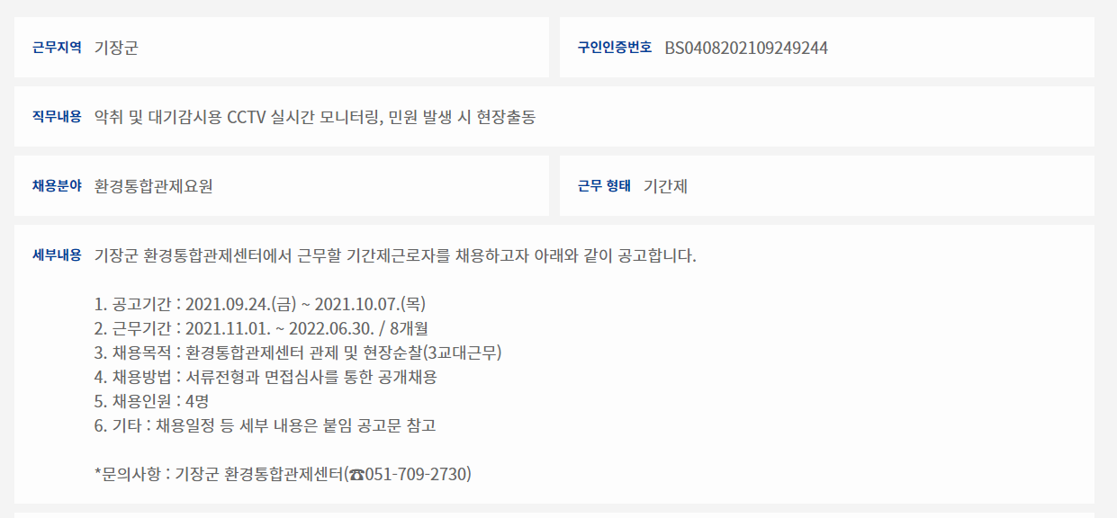 환경감시 기간제 근로자 부문입니다. 악취 및 대기감시용 CCTV를 모니터링하고, 현장순찰을 하는 업무입니다.