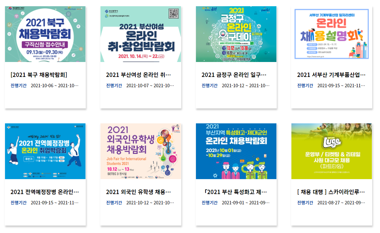 부산시에서는 지역뿐만 아니라, 각 여성/구별/특성별 박람회를 자주 개최합니다. 섬세하게 일자리에 대해서 챙겨주는 모습이 인상적입니다.