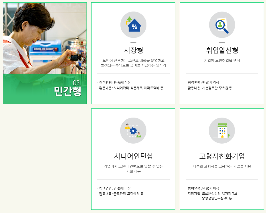 - 민간형 : 시니어카페, 식품제조, 아파트 택배, 취업알선형의 기업연계와 시니어 인턴십, 고령자친화기업등의 일자리가 있습니다.