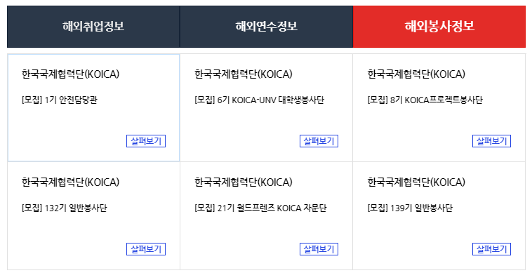 지역에서의 봉사가 아닌, 해외에서 소속감과 동시에 인정받을만한 봉사활동을 지원하는 것도 괜찮습니다. 우리나라에서는 코이카에서 해외봉사단을 봉사 특성에 맞게 진행하고 있습니다.