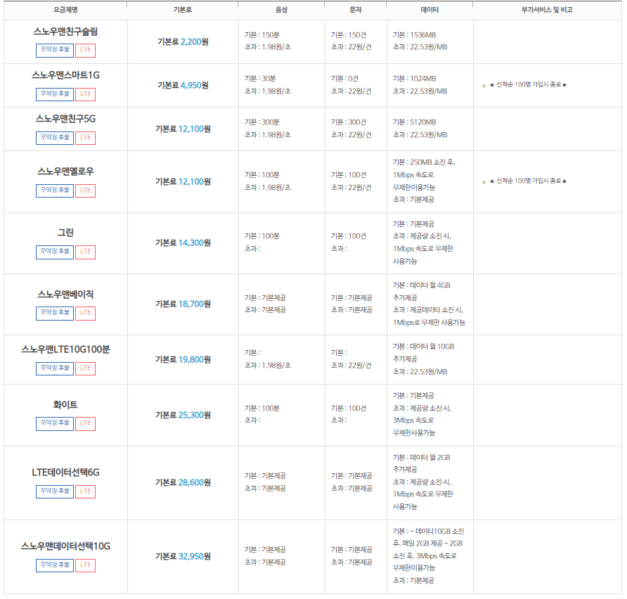 스노우맨 데이터 선택 10G는 기본요금 32,950원에 데이터 월 10GB를 제공합니다.