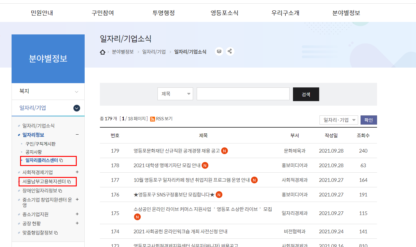 홈페이지 중간 부분에 분야별 정보를 보시면, '일자리/기업'이 보입니다. 그 부분을 클릭하시기 바랍니다.