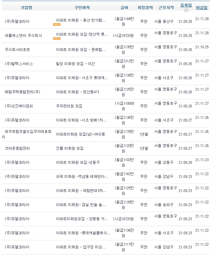 다만, 구직자의 경우는 실업급여 및 교육 등을 통해서 지원한 비 경력, 비 직무 인원가 매칭 서비스에 따라 바로 취업이 되는 유형 등이 존재하기 때문에, 수시로 남부 고용복지센터를 방문하시어, 정보를 최신화하시기 바랍니다.