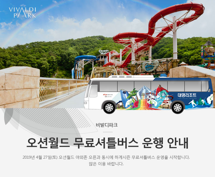 오션월드는 각 지역에서 셔틀버스를 운행하고 있습니다. 이용 전날 16:30까지 '버스라인' 홈페이지에서 사전 예약이 가능하며, 서울·경기 인근 노선은 대인 9,000원, 소인 7,000원, 경기 외곽 노선은 대인 10,000원, 소인 8,000원의 요금으로 이용할 수 있습니다.