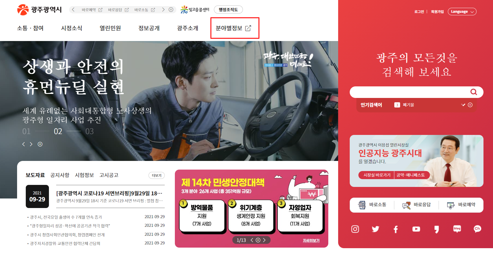 ① 광주광역시청의 분야별 정보에 일자리를 클릭하세요.
