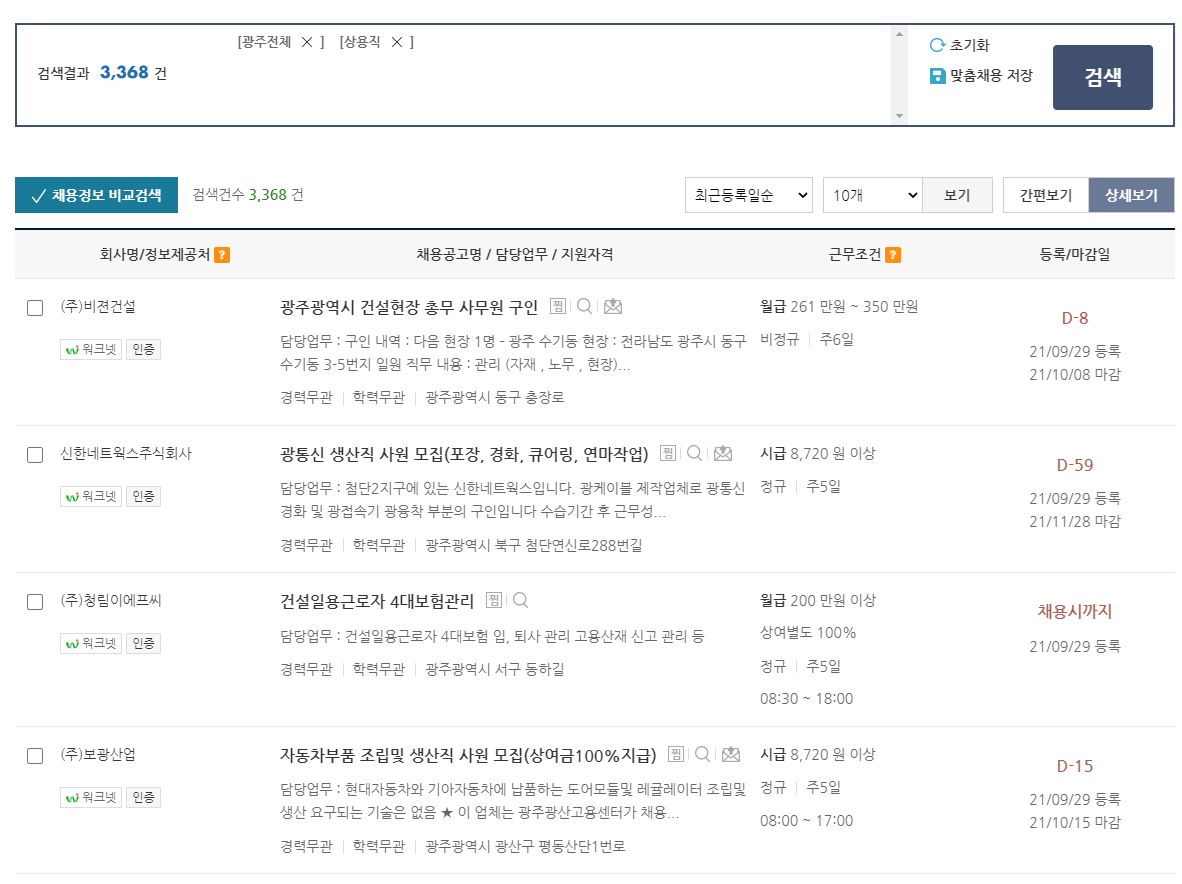 ④ 채용정보를 누르시면 포스팅 시점에 광주광역시의 전체일자리가 검색이 됩니다.