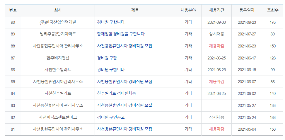 그러한 직무는 경비지도사 및 경력, 선임 배치교육을 수료한 부분을 채용하는 것으로서 대부분 2개월 이내에 긴급한 채용을 하는 경우가 많습니다. 이유는 경비를 채용하는 경우 경비지도사가 선임되어야 하고, 배치신고를 해야 하는 경비업법 행정신고 부분이 있기 때문입니다. 참고 바랍니다.