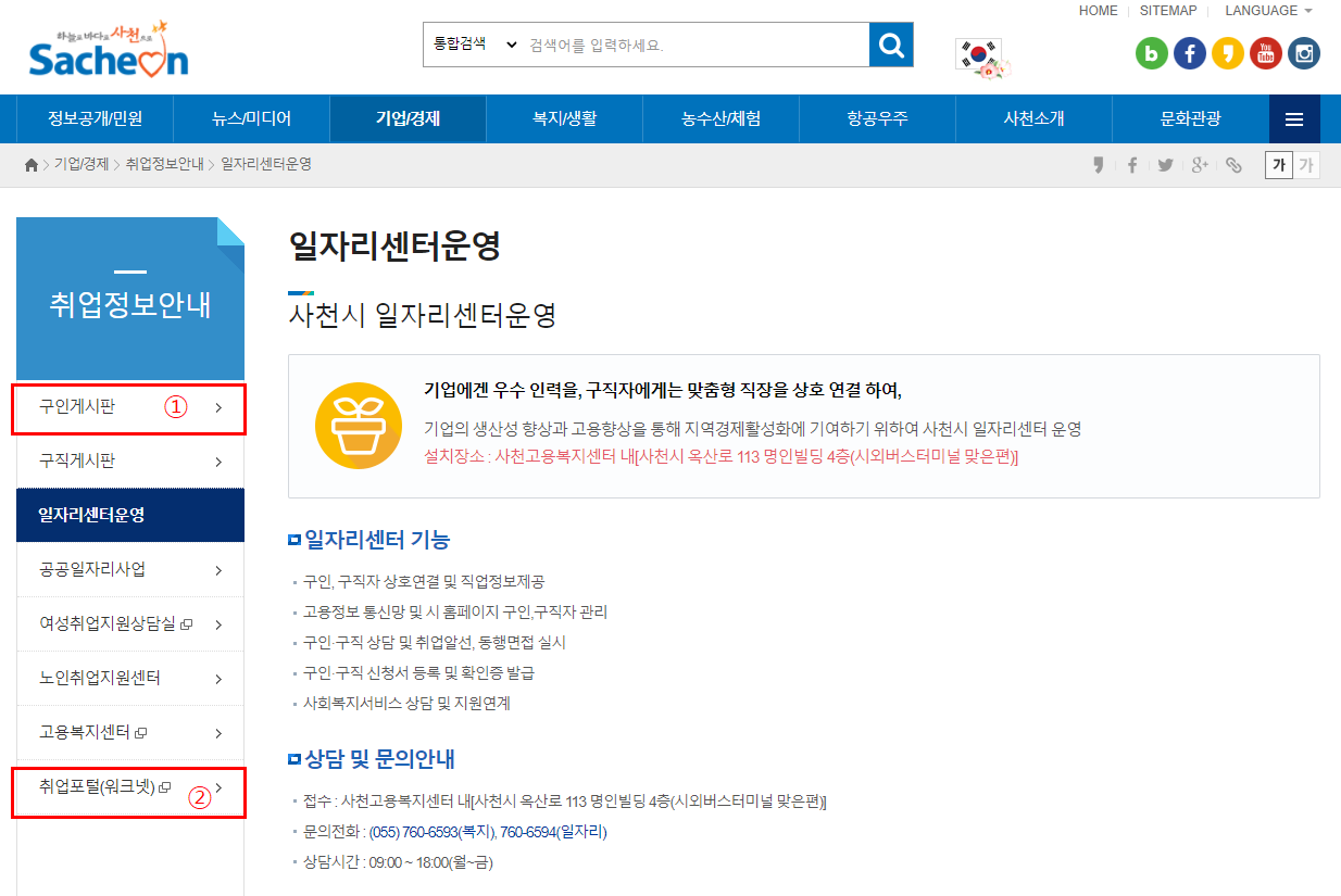 일자리센터 운영에 대한 소개를 하고, 왼쪽에 ① 구인게시판 ② 취업포탈 (워크넷)을 들어가셔서 확인하면 됩니다. 세부적으로 확인하여, 정보를 알려드리겠습니다.