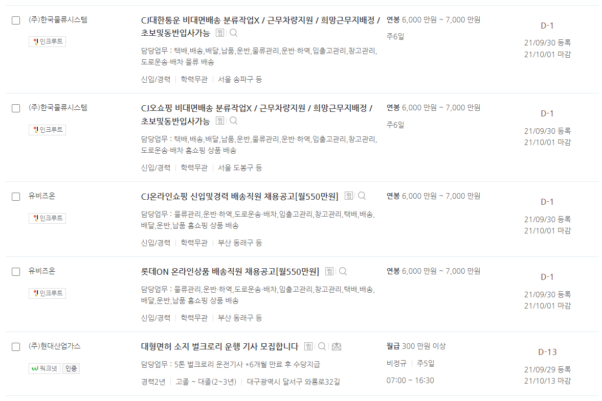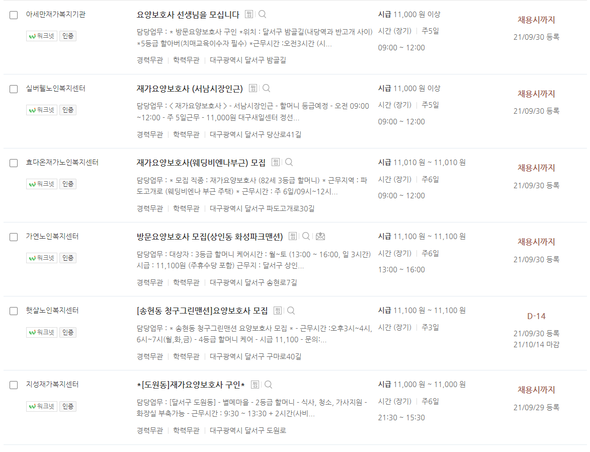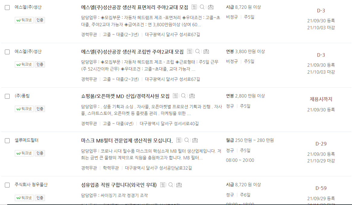 달서구 일자리 워크넷 구인구직 정보 Top 5