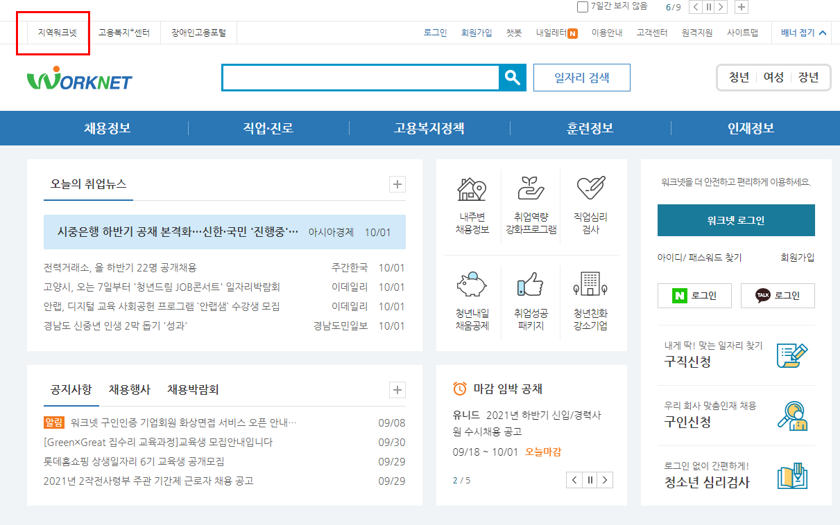② 지역 워크넷을 클릭하고, 아래 지역명에 경기 > 파주시를 선택 클릭합니다.