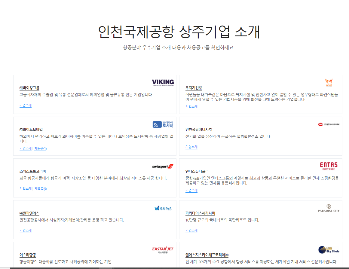 ① 인천공항의 상주에 있는 기업들의 현장채용으로 연결될 경우, 각 회사의 로고나 채용현황을 클릭하고 세부요건 등을 확인한 후 지원하시면 됩니다. 또는 기업을 바로 클릭하시면 채용정보현황을 알 수 있습니다.