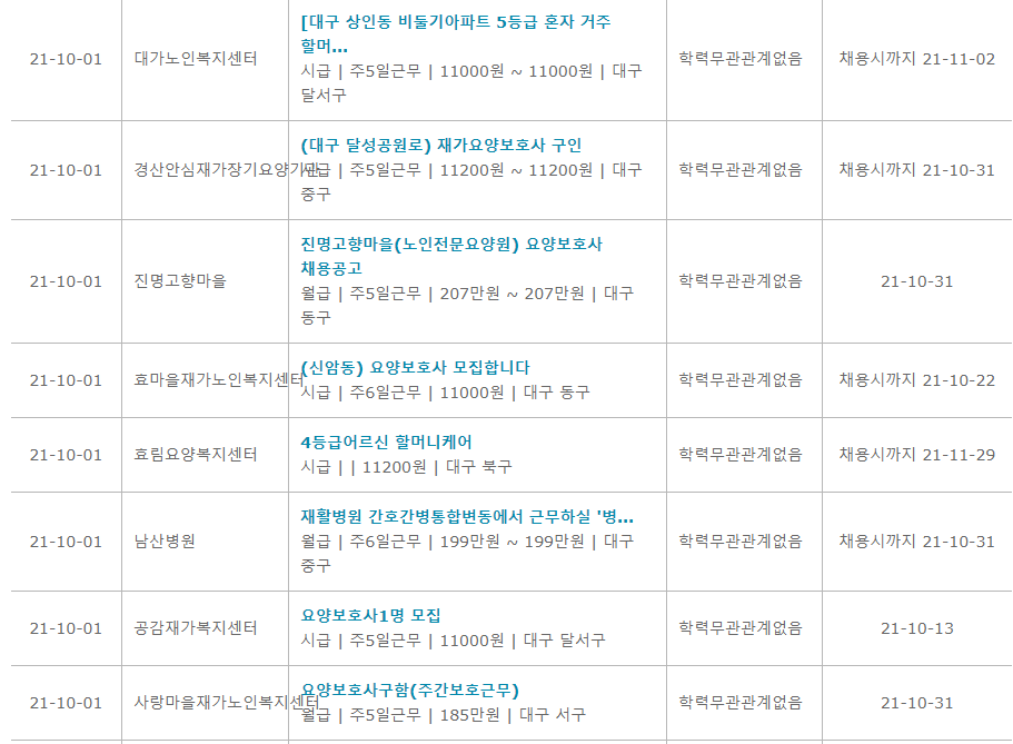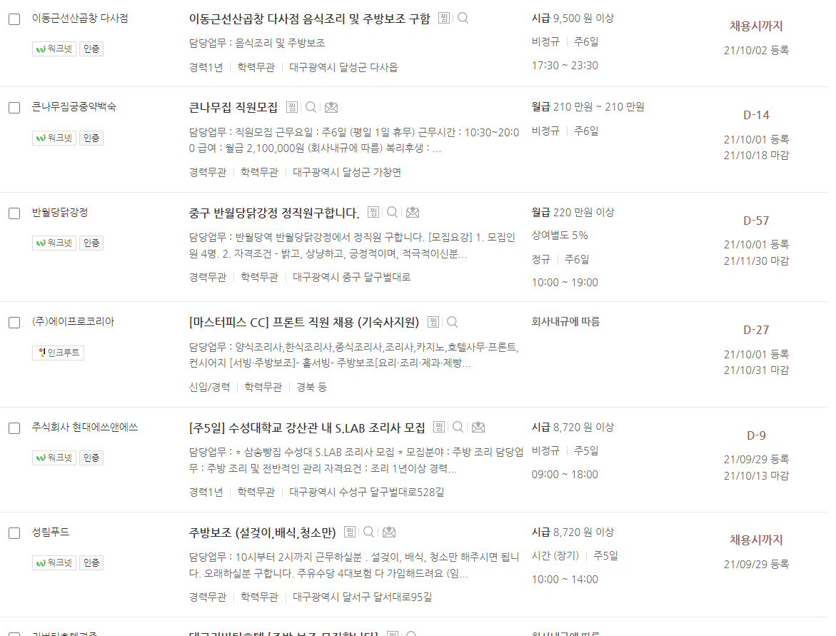 대구광역시에는 미화 청소직부터 생산, 공공일자리, 마트, 주방보조, 야간일자리, 요양보호사, 당일지급가능한 일당직까지 다양한 일자리가 있습니다.