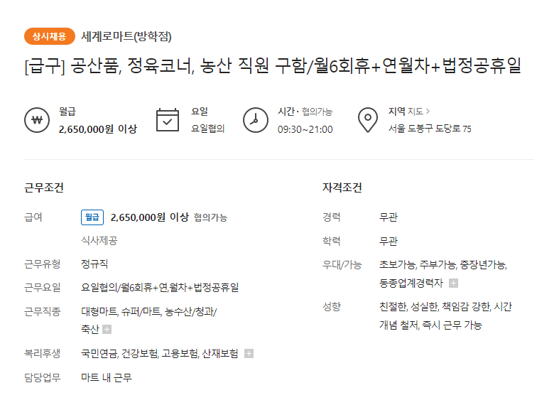 - 세계로마트 방학점 ㅣ 월급 265만원 ㅣ 근무시간 09시30분~21시