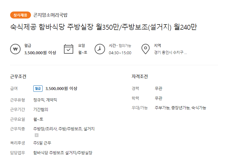 - 곤지암 소머리 국밥 ㅣ 함바식당 ㅣ 주방실장 ㅣ 급여 월 350만원 ㅣ 설거지 240만원