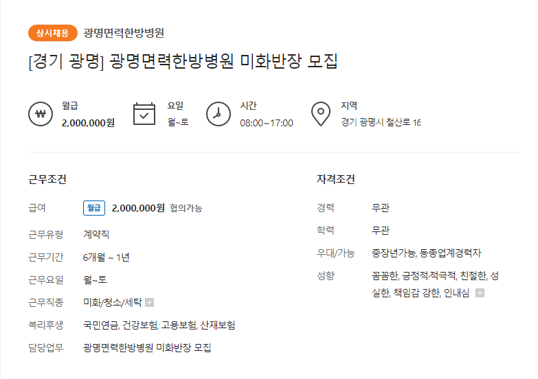 - 월급 2백만원 ㅣ 08시~17시 ㅣ 월~토, 월 1회 토요일 휴무 가능