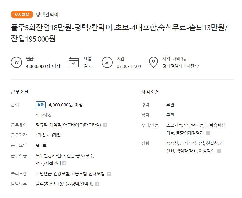 - 근무시간 07시~17시 ㅣ 건설현장, 기능공 보조 업무