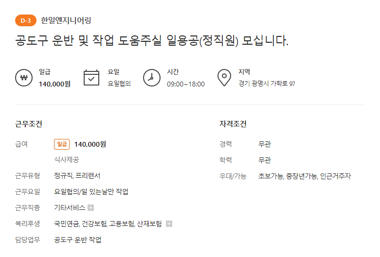 - 일급 14만원 ㅣ 08시~17시 ㅣ 4대보험 퇴직금 별도
