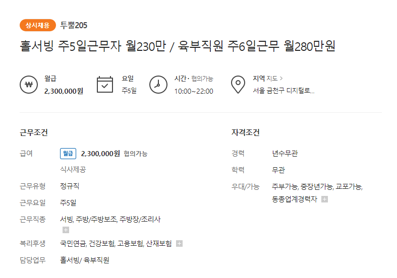 식당, 주방보조, 마트, 생산제조, 서빙, 배달대행, 요양보호사, 기타 등 주요 대표 직무 10가지를 요약해보았습니다. 유사직무 채용건은 각 직무당 5~10개 이상씩 있으며, 영업이나 보험 등의 경력이 필요한 것은 제외하였습니다.