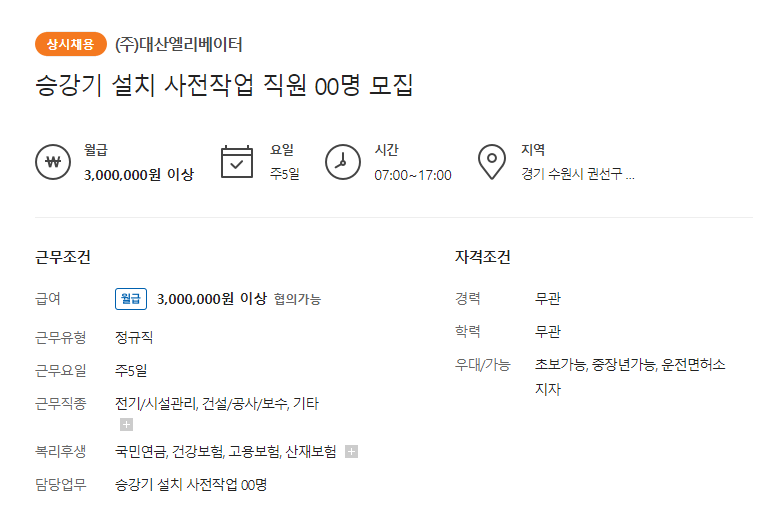 (3) 대산엘리베이터 승강기 설치 사전작업 직원 00명 모집