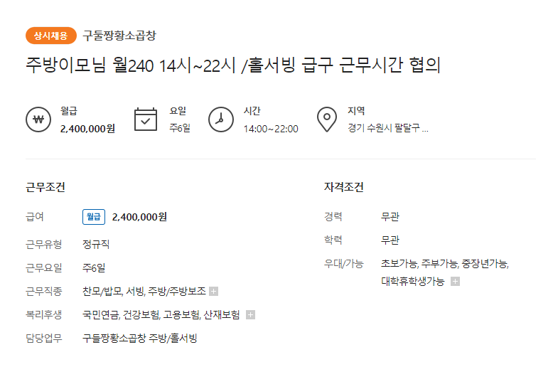 - 찬모, 밥모, 서빙 ㅣ 주방이모님 ㅣ 월급 240만원