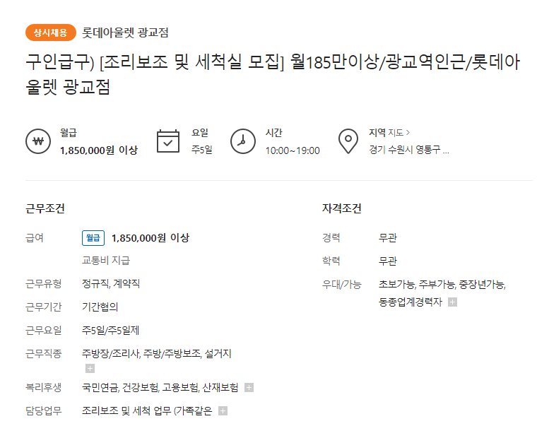 - 기타 매장내 레스토랑 조리 ㅣ 주방 ㅣ 보조 다수 구인 중 *임금은 세부페이지 별도확인 필요