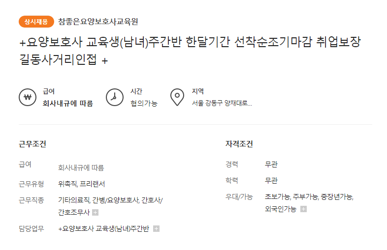 - 요양보호사 직무에 입사하려면 교육은 필수입니다. 인근지역에서 교육수료후 좋은 조건에 일자리를 찾으시기 발바니다.