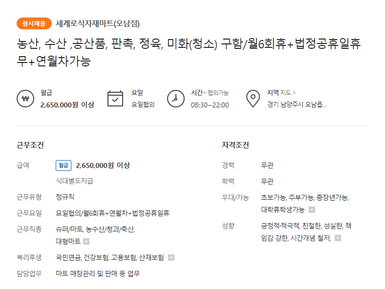 - 월급여 265만원 ㅣ 근무시간 08시 30분~22시