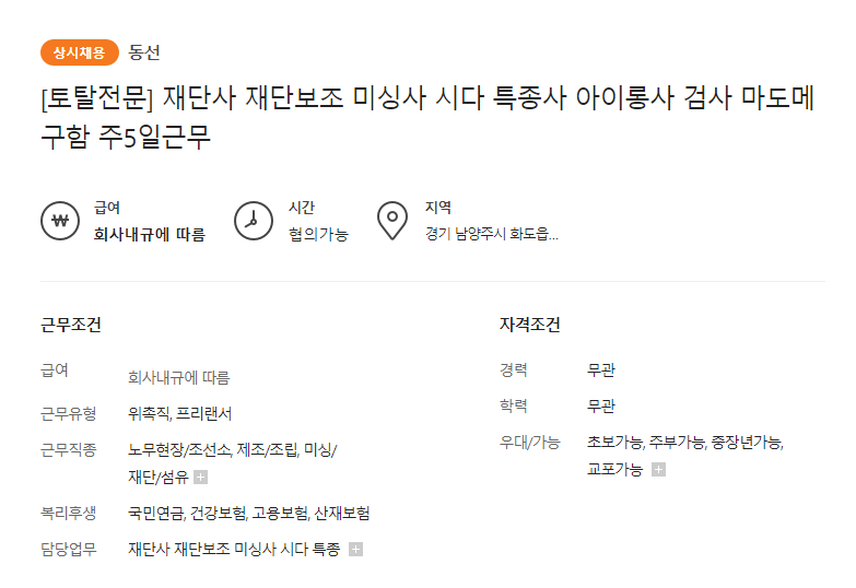 (1) 토탈전문 재단사, 재단보조 미싱사 시다 특종사 아이롱사 검사 마도메 구함