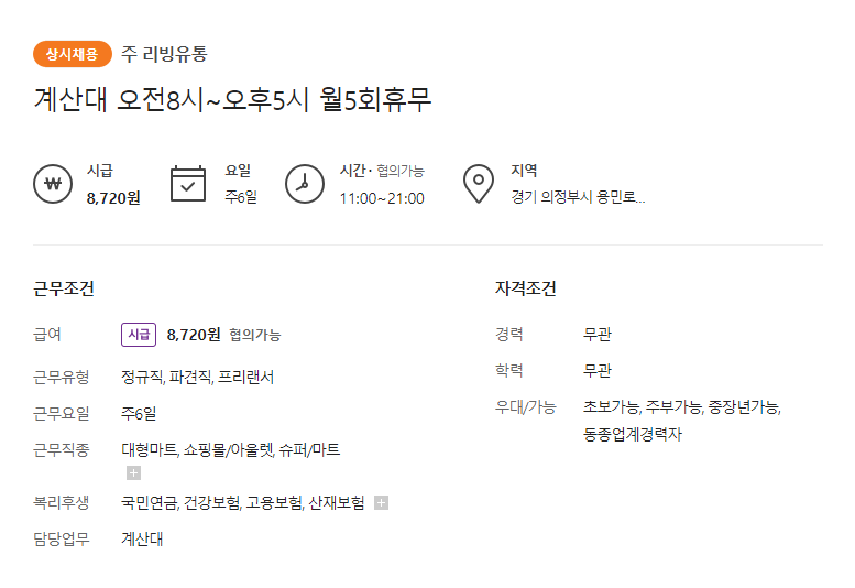 - 오전 8시~오후 17시 까지 근무 ㅣ 4대보험 및 퇴직금 별도지급