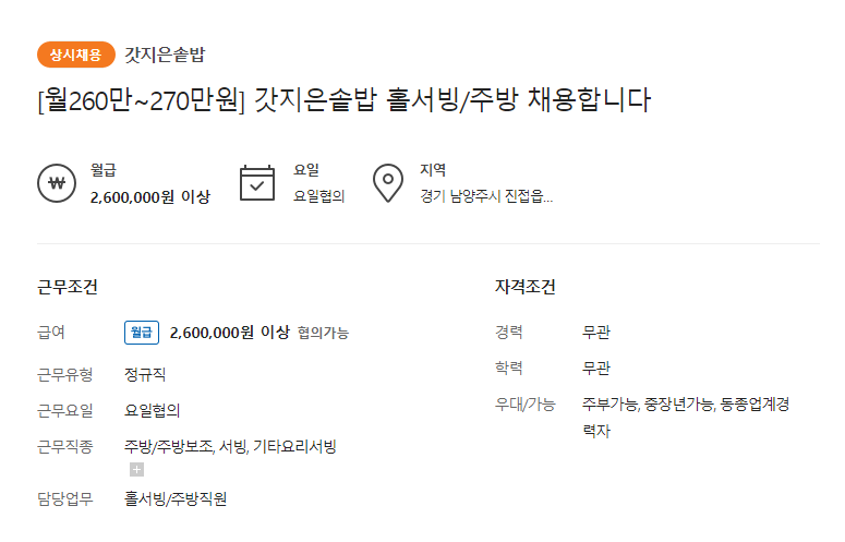 - 오전10시~오후 10시 ㅣ 홀서빙 260만원 ㅣ 주방직원 270만원