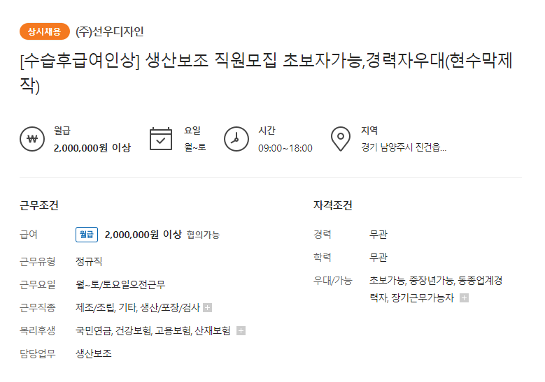- 주5일근무 이나 주 6일, 잔업가능자 별도 채용중입니다.