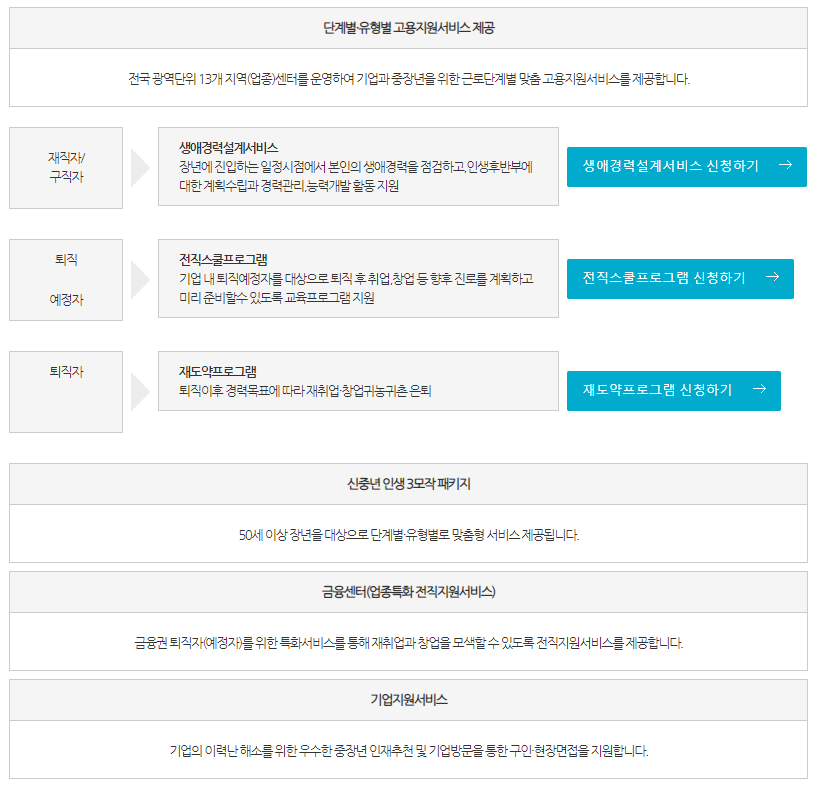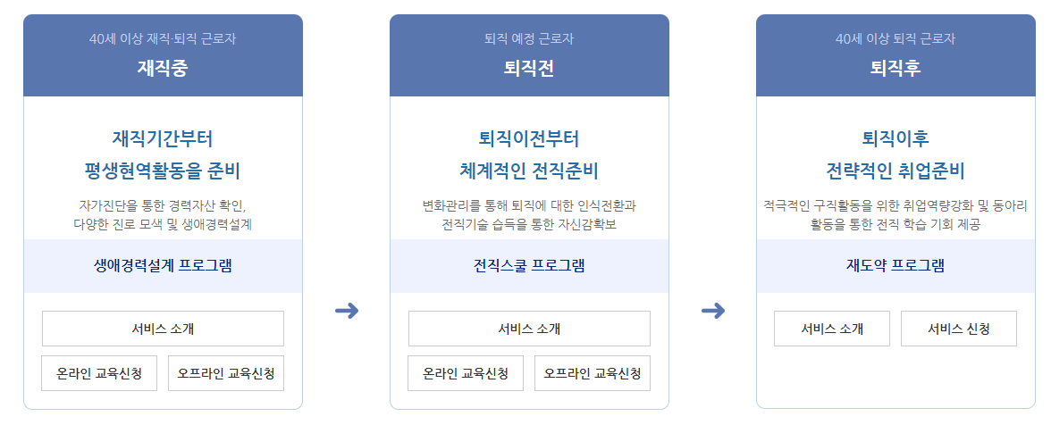 특히, 중장년층에 근로단계에 따라 재직자 대상 생애경력설계서비스, 퇴직예정자 대상 전직스쿨프로그램, 구직자 대상 취업지원서비스 등을 지원합니다