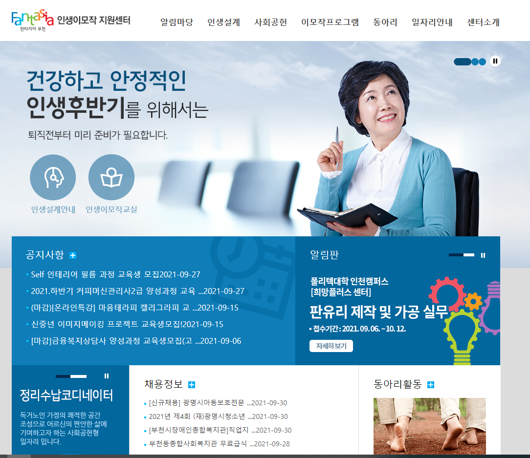 부천에 위치한 인생이모작 지원센터는 직장 은퇴자 및 은퇴준비자 등이 새로운 인생을 준비할 수 있도록 체계적이고 다양한 교육 및 프로그램을 운영하는 센터입니다.