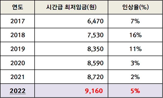 가. 시간급 최저임금 : 9,160원 (2021년 대비 5.0%인상)