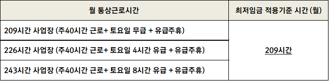 - 사례 1 : 월~금 (주5일), 1일 10시간 근로하는 근로자의 월 최저임금 (토요일은 무급휴무)