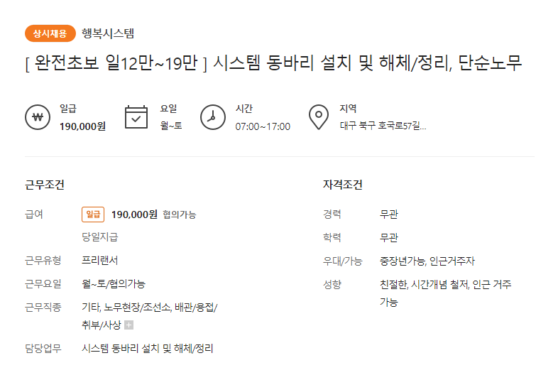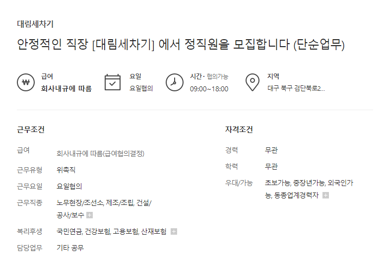 대구 북구 중장년 우대 즉시 취업 가능 일자리 10