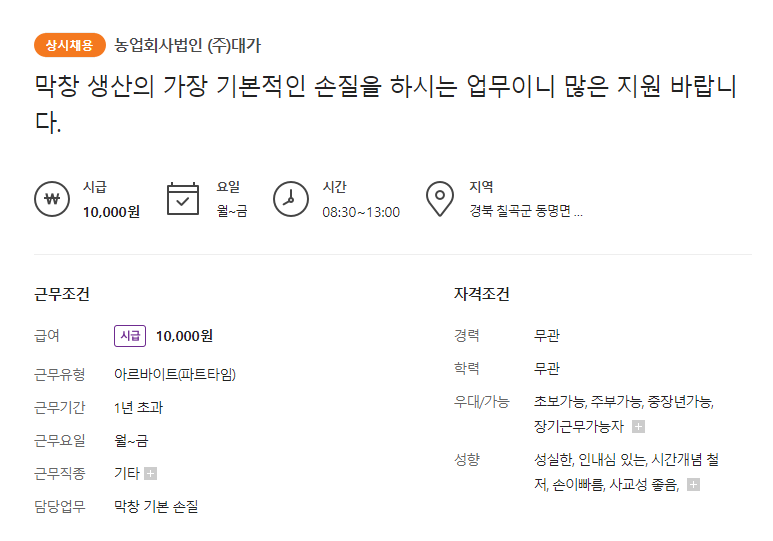 (9) 농업회사법인 대가 원재료 손질작업 직원모집