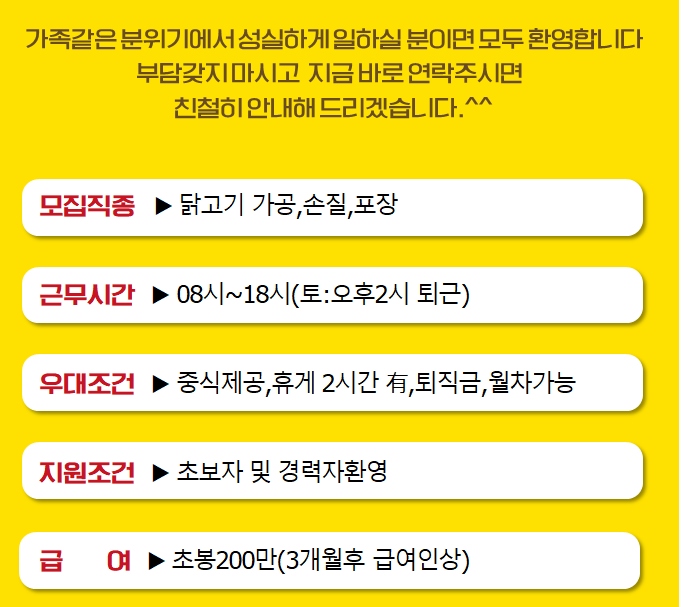 - 주5일근무 이나 주 6일, 잔업가능자 별도 채용중입니다.