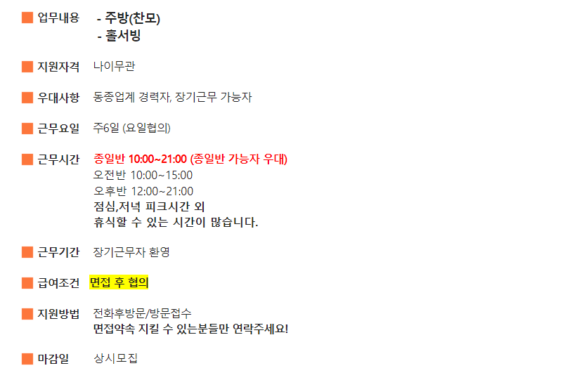 식당, 주방보조, 마트, 생산 제조, 서빙, 배달대행, 요양보호사, 기타 등 주요 대표 직무 10가지를 요약해보았습니다. 유사직무 채용건은 각 직무당 5~10개 이상씩 있으며, 영업이나 보험 등의 경력이 필요한 것은 제외하였습니다.