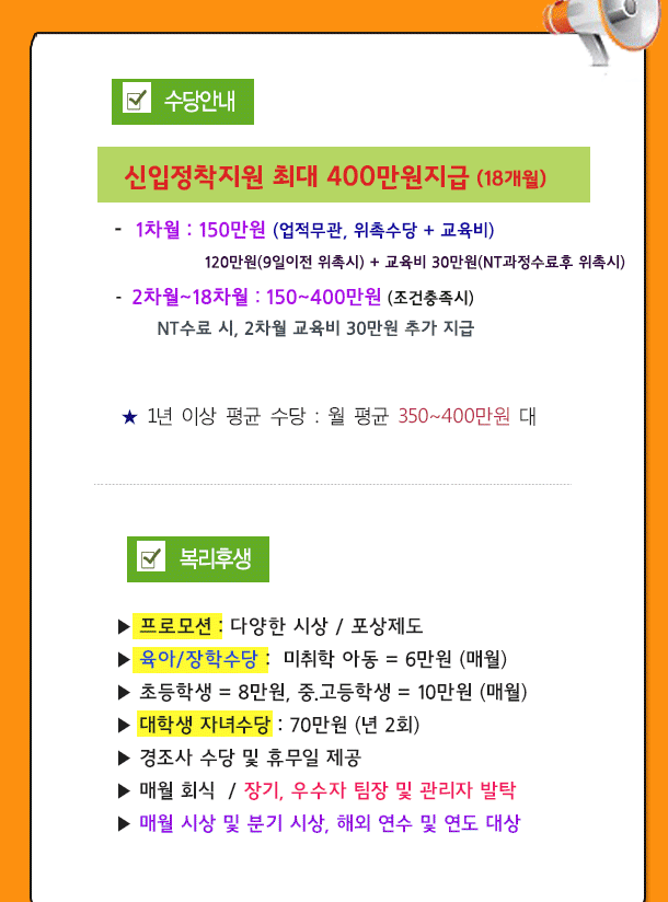 - 고정급여 183만원 수준 ㅣ 평균 203만원 급여 ㅣ 초기부담금 없습니다