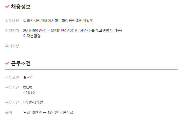 - 근무시간 별도 ㅣ 일급 15만원 평균기재