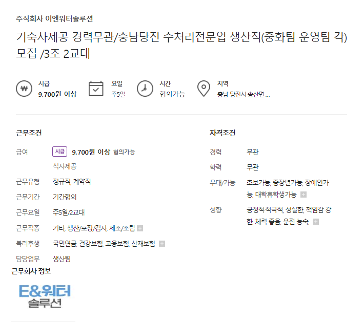 - 충남 당진 수처리전문업 생산직 ㅣ 주5일 ㅣ 2교대 08시~20시, 20시~08시