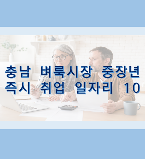 충남의 즉시 취업가능한 중장년층 일자리에 대해서 알아보았습니다. 각 지역에서의 채용정보는 즉시 취업이 가능하고 다소 중장년층과 경력단절 재기가 필요한 분들에게 더욱 효과적일 수 있습니다.