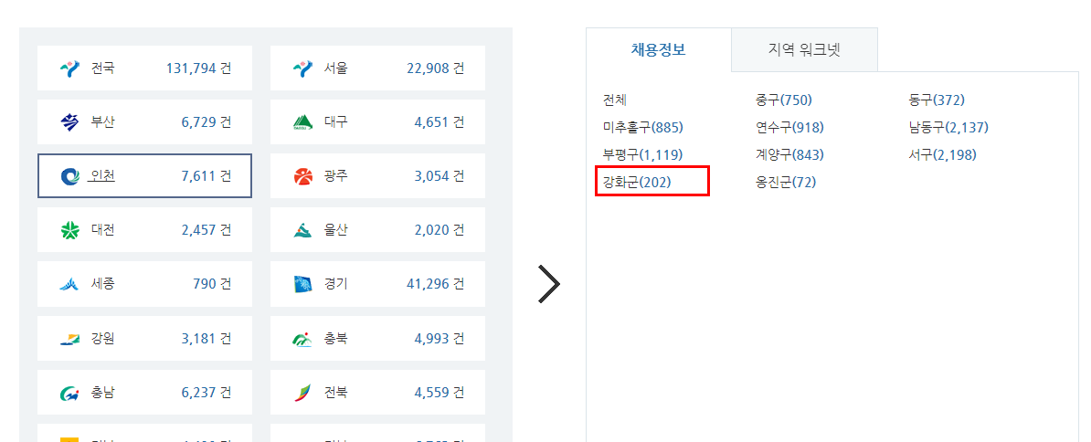 ③ 지역 워크넷을 클릭하여, 인천 > 강화군을 선택합니다.