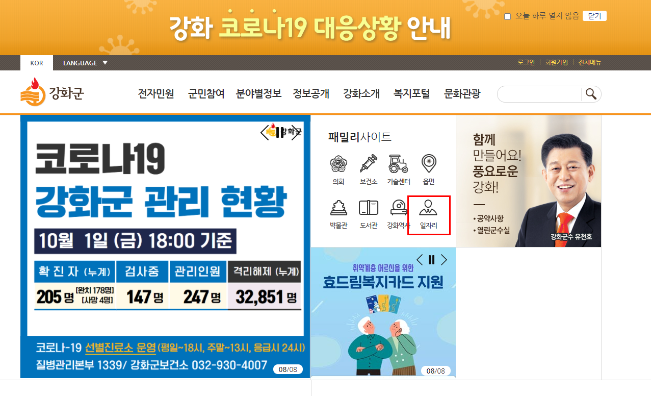 특히, 강화군에서는 시민들의 생활정보 및 복지혜택이 보기 쉽게 잘 구성되어 있습니다. 일자리뿐만 아니라 지역생활에 도움을 주는 정보도 많이 있으니, 평소에 홈페이지에 자주 가보시는 것도 좋을 것 같습니다.