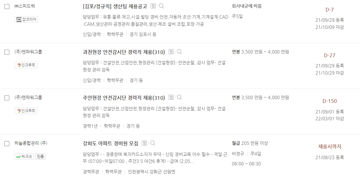 위에서 언급한 경비직 무중에서도 보안대장, 관리원, 반장 등의 중간 간부급의 일자리가 종종 보입니다.