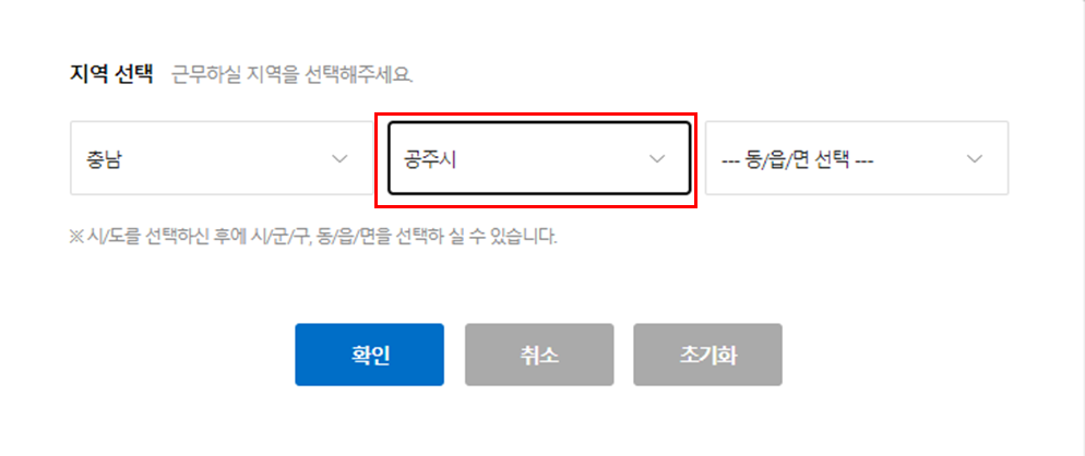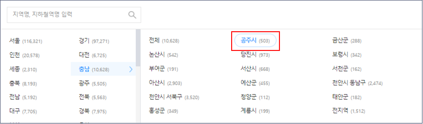 먼저, 잡코리아에 접속 > 지역별 세부메뉴에서 충남 > 공주시를 선택하시면 됩니다.